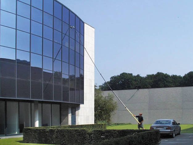 Vom sicheren Boden reinigen wir mühelos und effizient auch schlecht oder schwierig erreichbare Fenster und Fassaden.